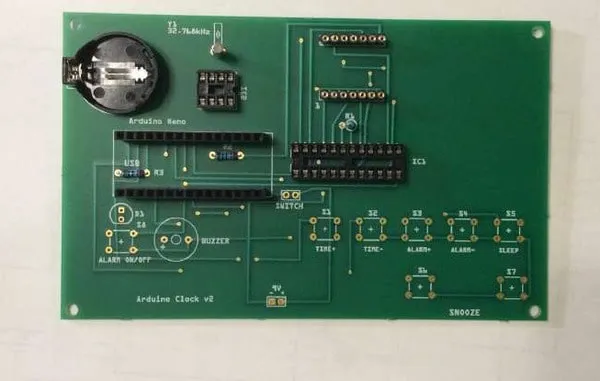 The Arduino Clock v2 is an open-source, easy-to-use alarm clock running on an Arduino Nano. It features a bright 4-digit seven-segment display with decimal points, large snooze button, and two ways to be powered - USB or battery.